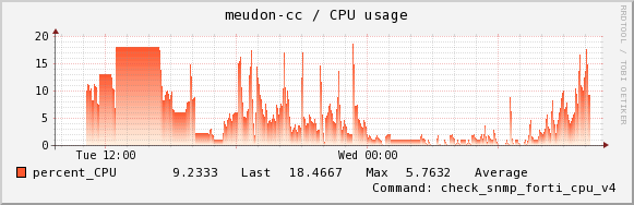 # paramètres de check_snmp : # -P2c pour préciser le version de SNMP (2c) # -t5 pour préciser le timeout (en secondes) de la commande # -l <STRING> pour préciser l'étiquette du résultat (elle sera utilisée par le graphe) # et les classiques mandataires : -C <COMMUNAUTE> et -o <OID> define command{ command_name check_snmp_forti_cpu_v4 command_line /usr/lib64/nagios/plugins/check_snmp -H '$HOSTADDRESS$' -P2c -t5 -l "percent_CPU" -C '$ARG1$' -o .1.3.6.1.4.1.12356.101.4.1.3.0 } # le service est rattaché au groupe fortigate_v4 define service { name check-snmp-forti-cpu-v4 hostgroup_name fortigate_v4 use generic-service-no-notif service_description CPU usage check_command check_snmp_forti_cpu_v4!public }