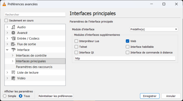 On peut activer l'interface web afin de contrôler VLC depuis un autre PC, par exemple sur le même réseau local. Pour cela, ouvrir les paramètres (Ctrl+P), en bas à gauche, sous “Afficher les paramètres”, cliquer sur “Tous”. Aller ensuite dans Interface, Interfaces principales et sélectionner “Web” :